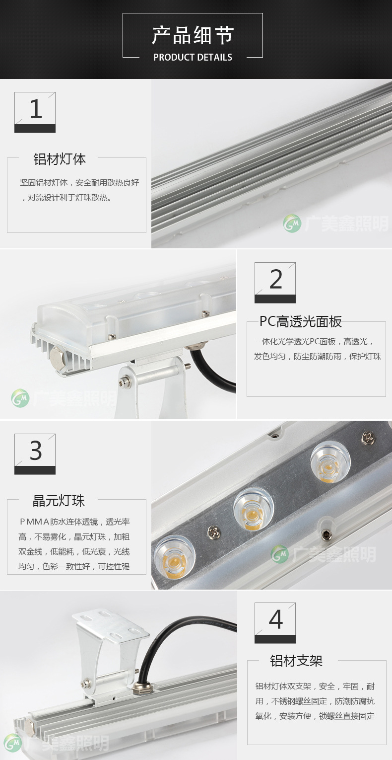 | Power | 24(W) | Light color | RGB colorful internal control, DMX512 external control, monochrome, custom can contact customer service