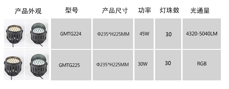 | 用途范圍 | 公園、廣場、建筑、酒店、景區、及湖邊、小區等戶外工程亮化 | 特色服務 | 質保兩年,破損補發 | 產品規格 | GMTG223,GMTG224,GMTG225,GMTG223帶檐,GMTG224帶檐,GMTG225帶檐 |