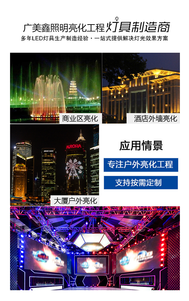 隨著亮化技能的開展,傳統的光源已經不能完全滿足人們對照明的要求,現在洗墻燈led光源越來越受亮化工程的喜歡,目前市場上出售的主要有兩種洗墻燈led光源。一種是COB集成點光源,其多個芯片直接結合,另一種是單個洗墻燈led光源與PCB板拼接,貼片面光源。1、更亮更好的光線景象照明的主要功能是安全和裝修。 LED投光燈和LED洗墻燈被認為是最亮堂的光線方式。它可以達到每瓦110至120流明,并